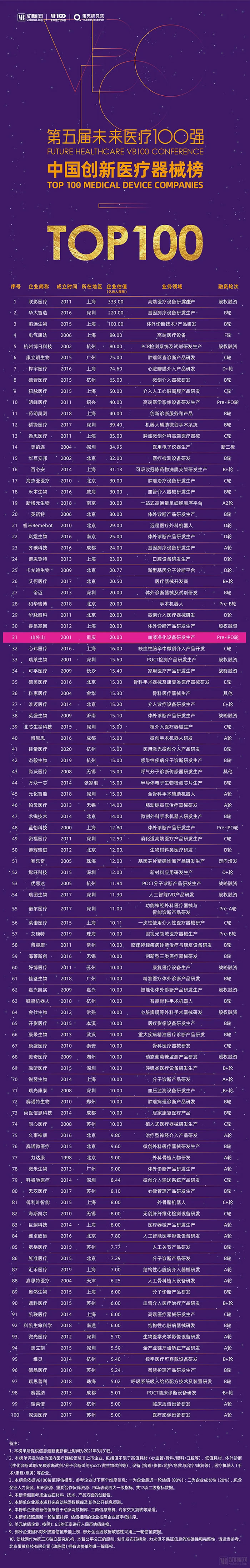 會上,醫(yī)療領(lǐng)域?qū)I(yè)服務機構(gòu)及媒體動脈網(wǎng)與蛋殼研究院聯(lián)合發(fā)布了《2020-2021未來醫(yī)療100強系列榜單》。未來醫(yī)療100強系列榜單旨在遴選真正代表未來醫(yī)療的中國創(chuàng)新醫(yī)療者,發(fā)現(xiàn)我國未來醫(yī)療產(chǎn)業(yè)的核心力量,推動健康醫(yī)療產(chǎn)業(yè)的創(chuàng)新變革進程。其中,中國創(chuàng)新醫(yī)療器械榜的企業(yè)篩選側(cè)重考慮材料、技術(shù)、產(chǎn)品方面的創(chuàng)新性。
