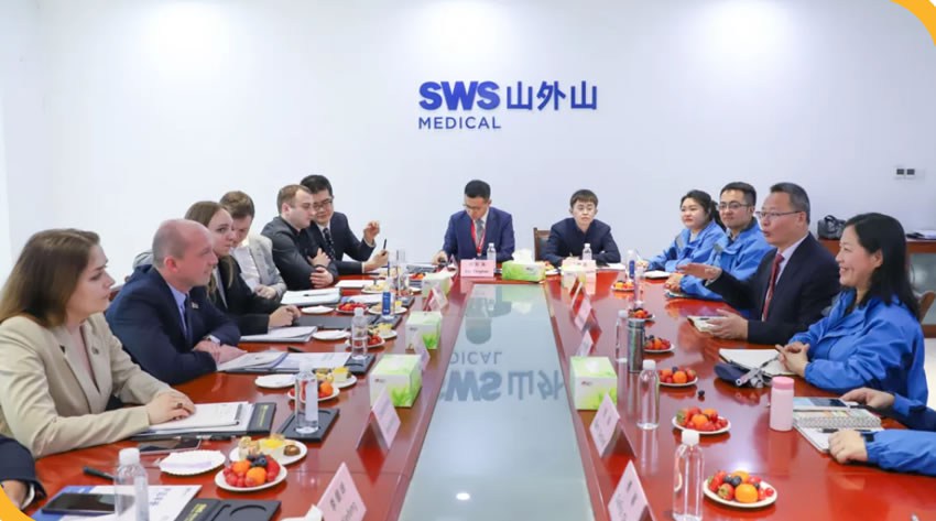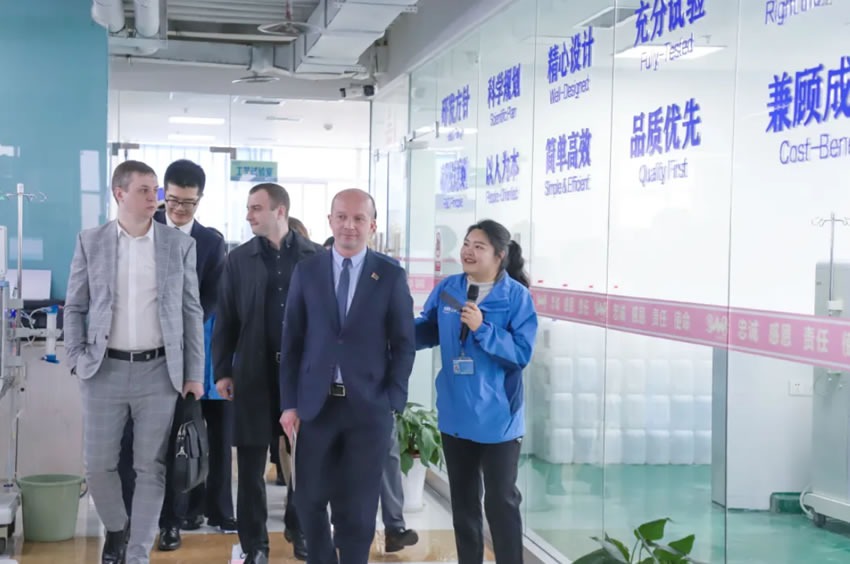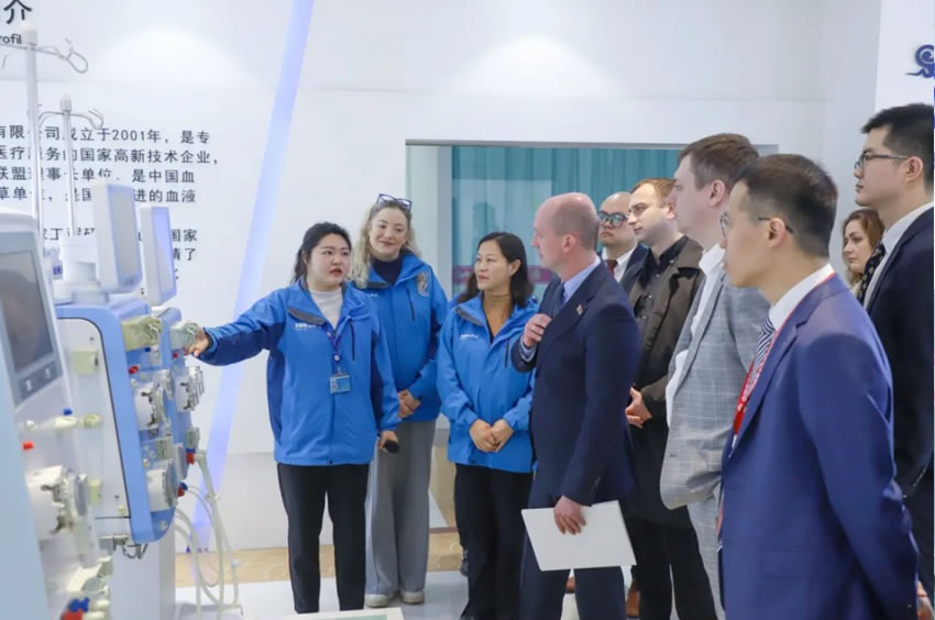 亞歷山大?波德科維羅夫公使參贊一行在山外山國際營銷團(tuán)隊(duì)及公司高管帶領(lǐng)下,參觀了企業(yè)展廳、研發(fā)中心及智能化生產(chǎn)線,詳細(xì)了解了山外山在血液凈化設(shè)備、耗材研發(fā)及血透智能大數(shù)據(jù)方面的核心技術(shù)與創(chuàng)新成果。